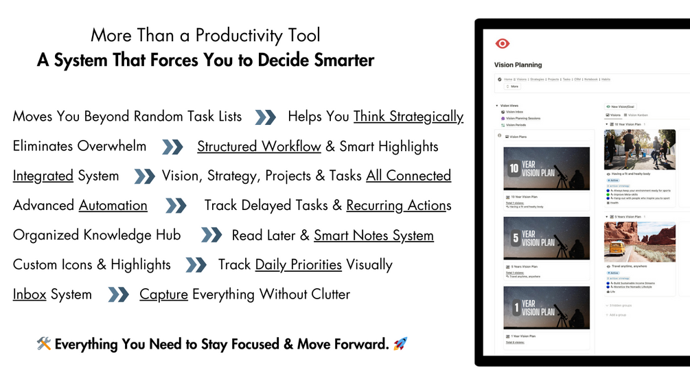 Most productivity tools focus on daily tasks, not strategic planning. This template helps you think like a strategist: