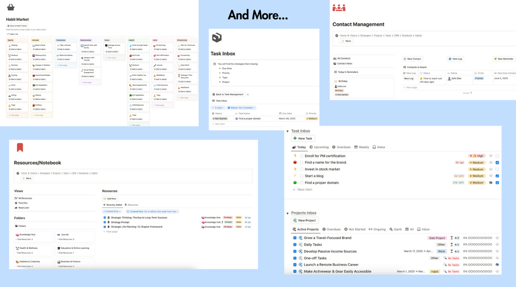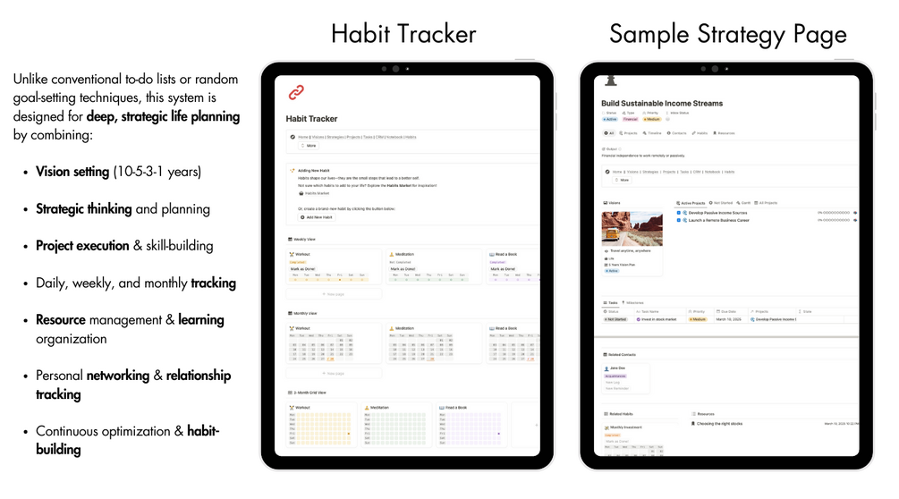 Building a structured, strategic life-planning system from scratch takes a lot of time, effort, and experience. This template is designed to provide a tested and optimized framework so you can focus on taking action rather than organizing endless pages.